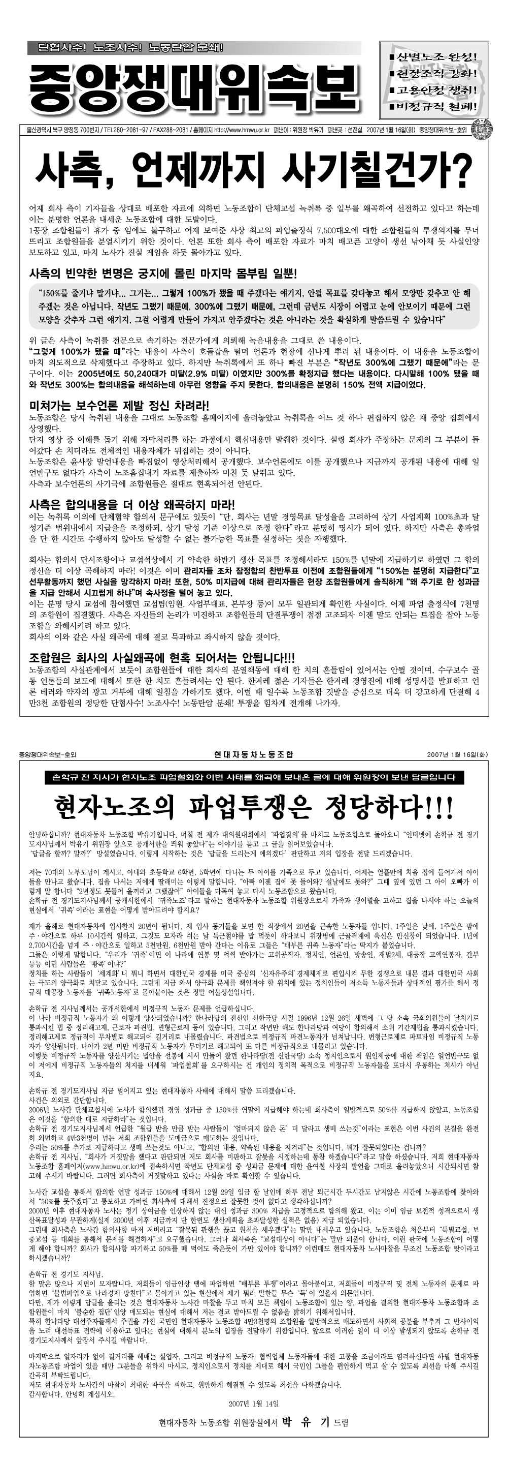 ³ëµ¿Á¶ÇÕÀÇ ´ë ¹Ý°Ý¿¡ ´çȲÇÑ »çÃøÀº ÀÌÁ¦ ³ìÃë·Ï ³»¿ë±îÁö ³ëµ¿Á¶ÇÕÀÌ ÆíÀì, ¹ßÇ¥Çß´Ù°í °ÅÁþ¸»À» ÀÏ»ï°íÀÖ¾î Çö´ëÀÚµ¿Â÷ ³ë.»ç °ü°è°¡ °¥µ¥±îÁö °¡°í ÀÖ´Ù.