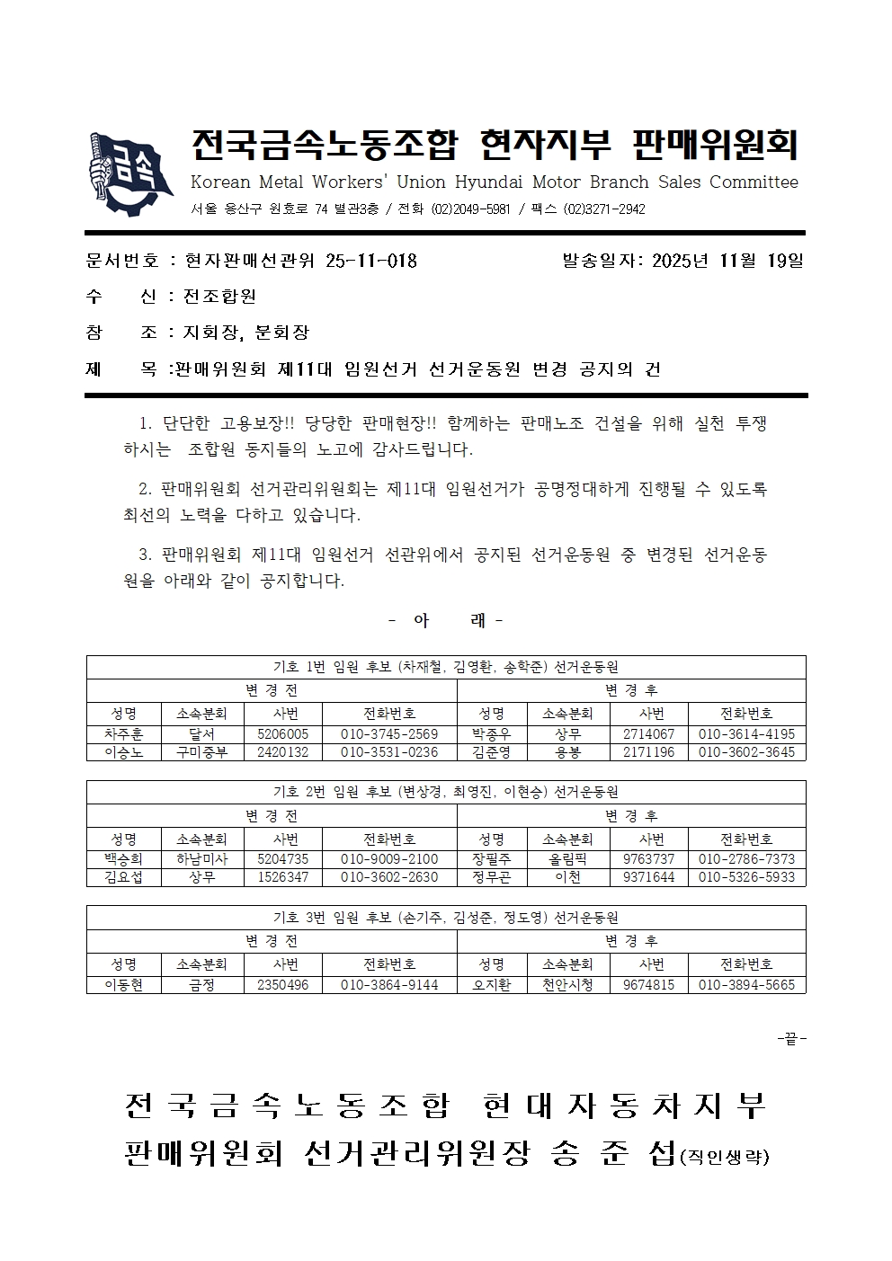 [¼±°üÀ§] ÆÇ¸ÅÀ§¿øÈ¸ Á¦11´ë ÀÓ¿ø¼±°Å ¼±°Å¿îµ¿¿ø º¯°æÀÇ °Ç