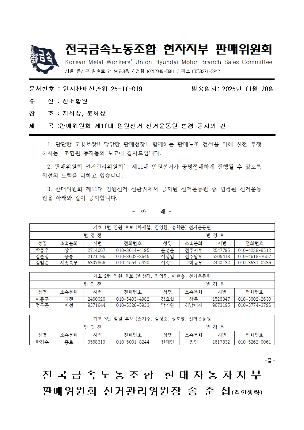 [¼±°üÀ§]ÆÇ¸ÅÀ§¿øÈ¸ 11´ë ÀÓ¿ø¼±°Å ¼±°Å¿îµ¿¿ø º¯°æ °øÁöÀÇ °Ç
