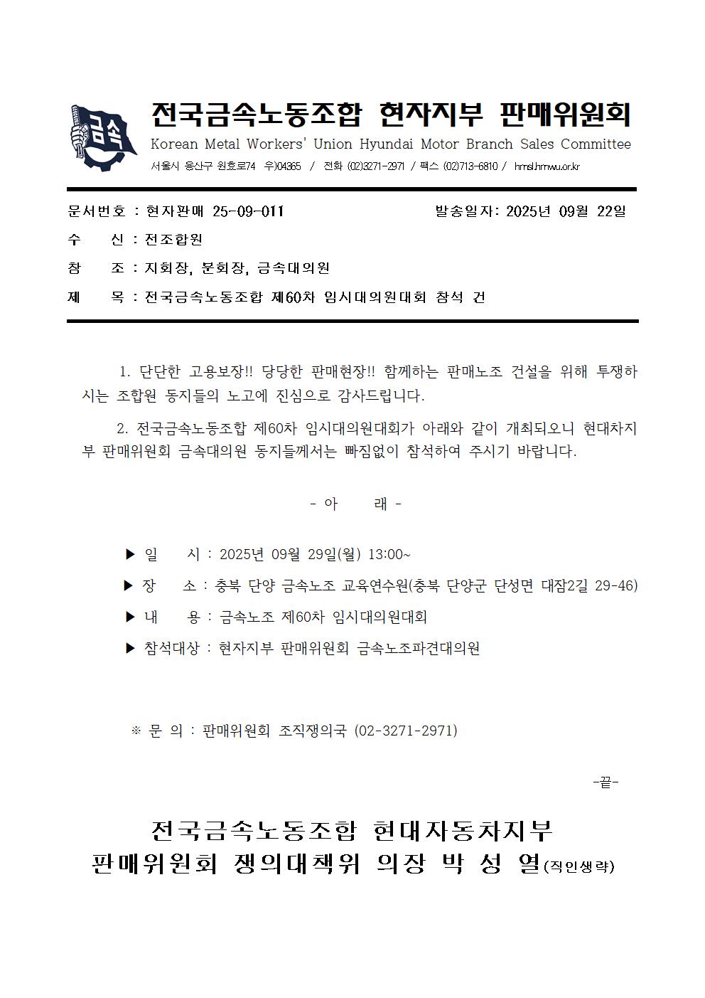 [°ø¹®]Àü±¹±Ý¼Ó³ëµ¿Á¶ÇÕ Á¦60Â÷ ÀӽôëÀÇ¿ø´ëȸ Âü¼® °Ç