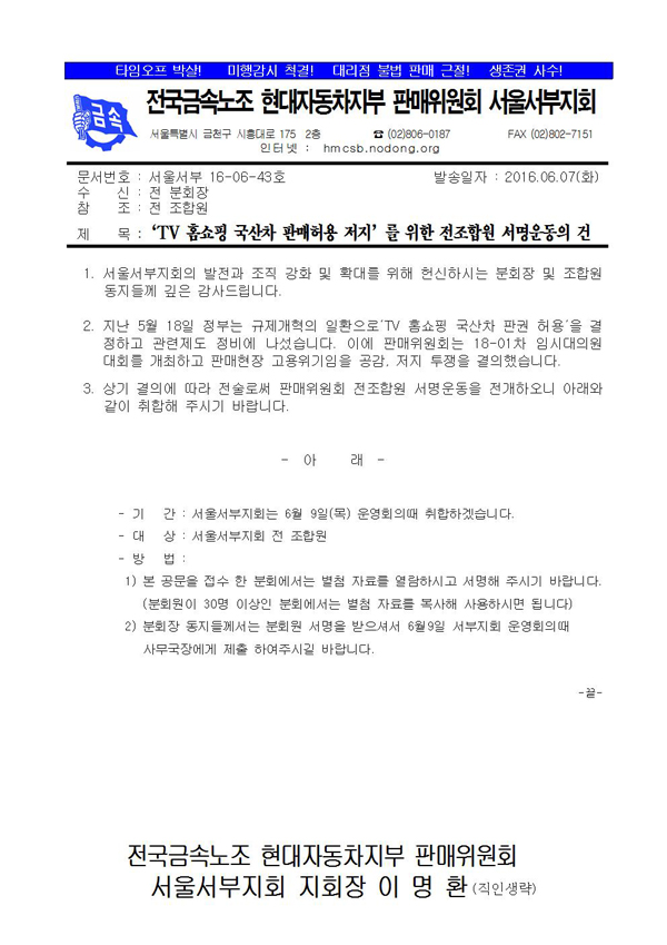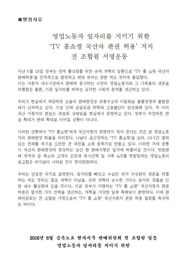 [°ø¹®]TV Ȩ¼îÇÎ ±¹»êÂ÷ ÆÇ¸ÅÇã¿ë ÀúÁö¡¯¸¦ À§ÇÑ ÀüÁ¶ÇÕ¿ø ¼¸í¿îµ¿ÀÇ °Ç