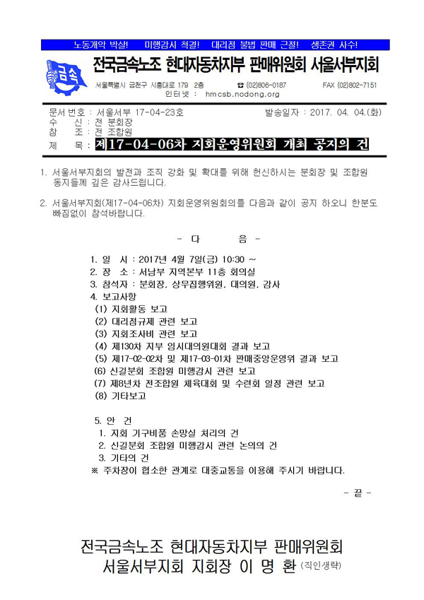 [°ø¹®]Á¦17-04-06Â÷ Áöȸ¿î¿µÀ§¿øÈ¸ °³ÃÖ °øÁöÀÇ °Ç