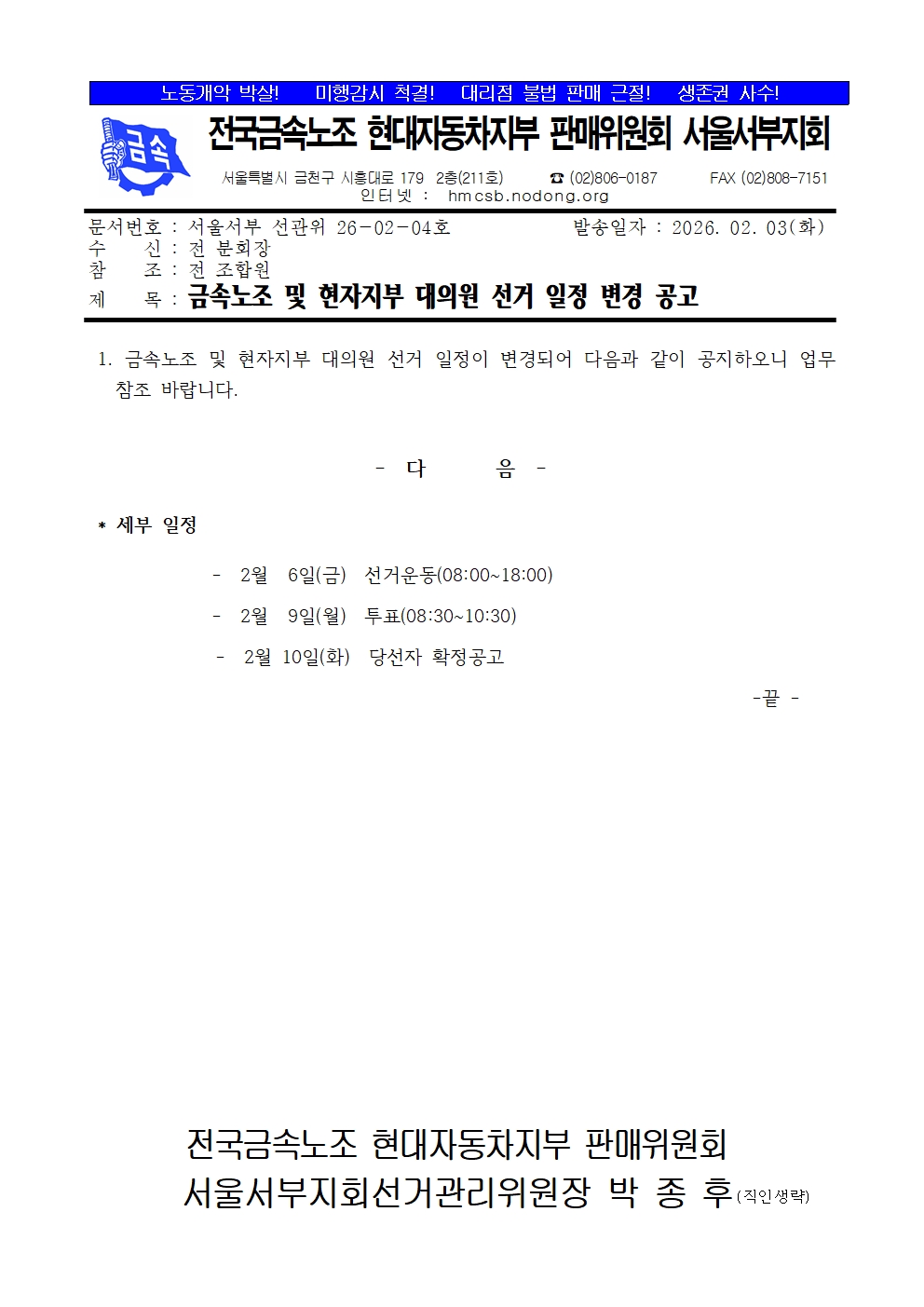 [¼±°üÀ§]±Ý¼Ó³ëÁ¶ ¹× ÇöÀÚÁöºÎ ´ëÀÇ¿ø ¼±°Å ÀÏÁ¤ º¯°æ °ø°í